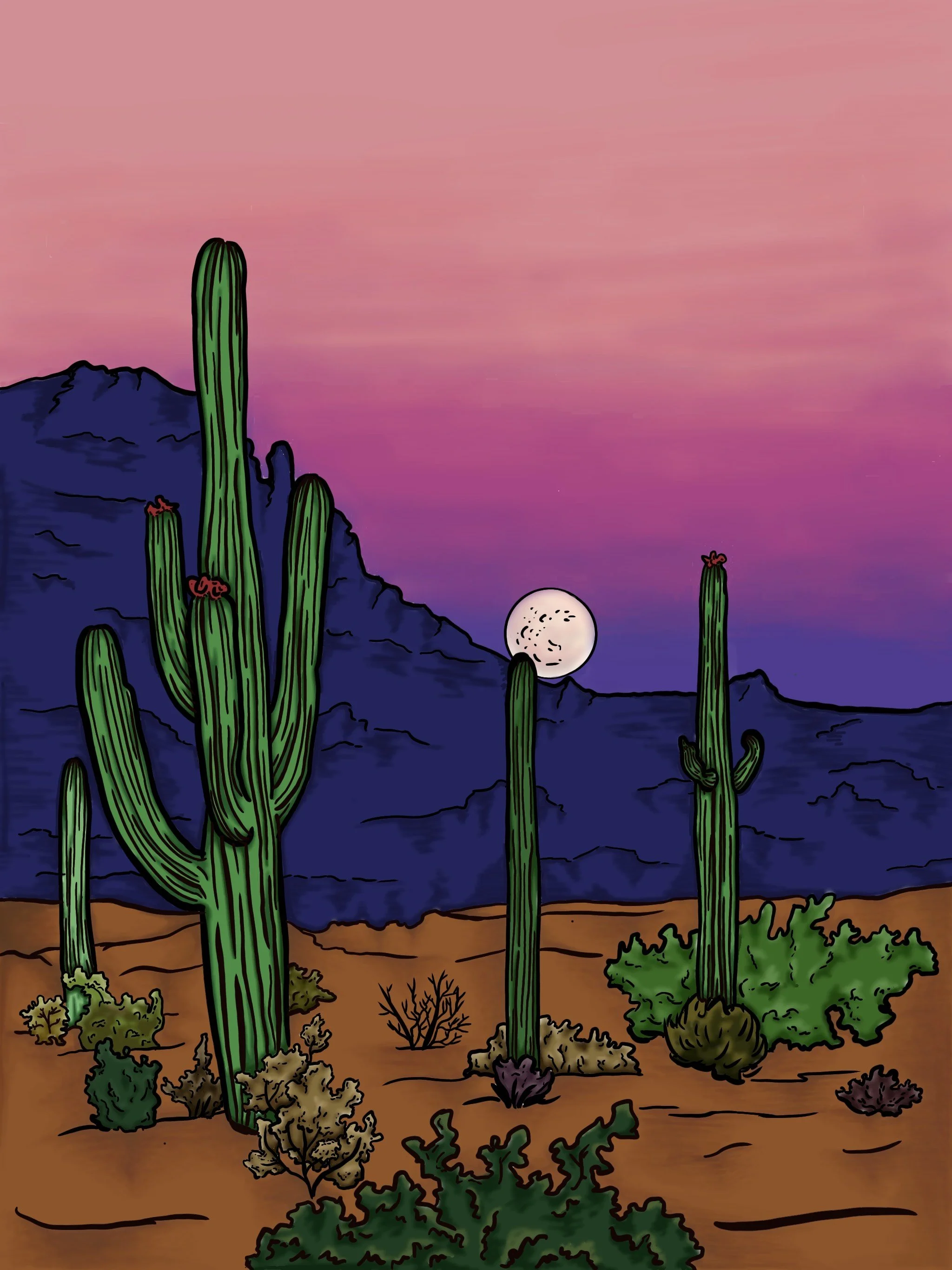 n this digital painting evening is falling and the moon is rising over a quiet desert. The cacti and landscape are full of warmth even as the shadows creep in